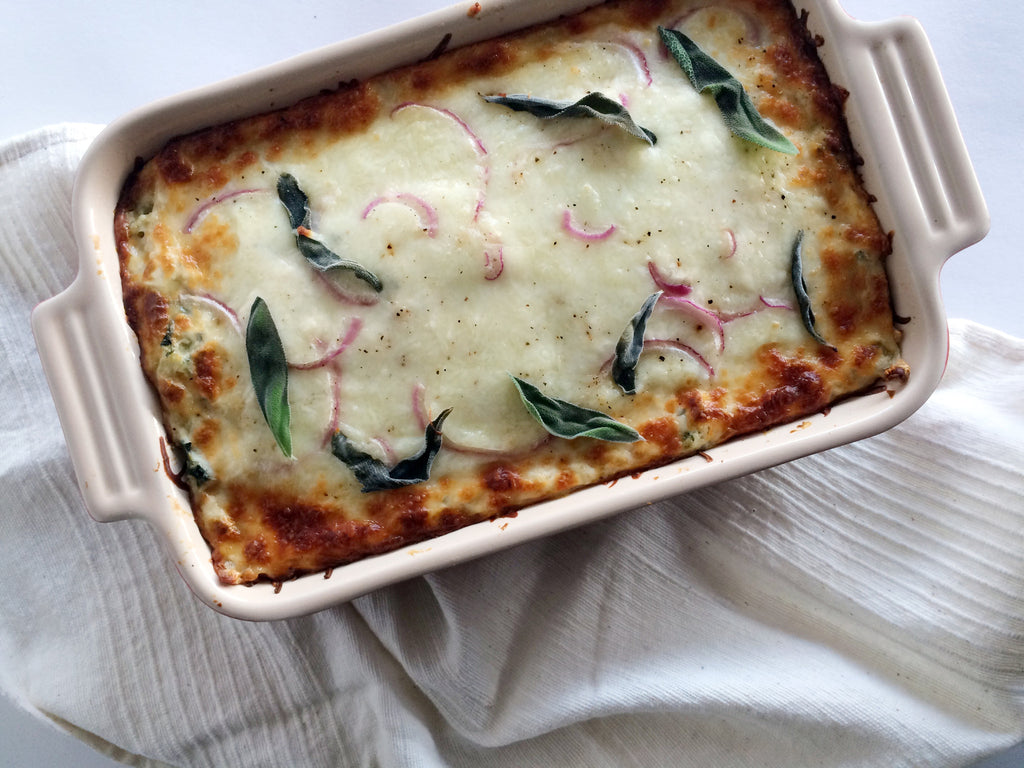 1 cup mashed sweet potatoes (season with salt, pepper and chopped fresh sage; pumpkin will work well for this layer too, and will give the dish more of a fall color scheme than my sweet po’s)