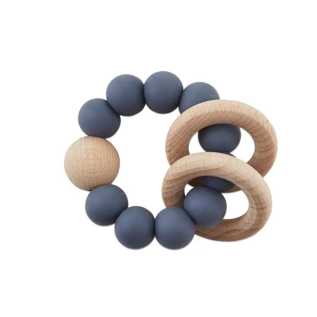 Designed with safety in mind, this teething ring contains buttery soft, 100% food-grade silicone beads + natural, untreated beech wood rings. The rings create a soothing rattle for your little one. Beech wood is naturally splinter-free + has natural antibacterial + antimicrobial properties. This teether is soft on baby gums + emerging teeth - perfect to soothe + entertain from newborn to toddler. Sold individually. Color is grey.