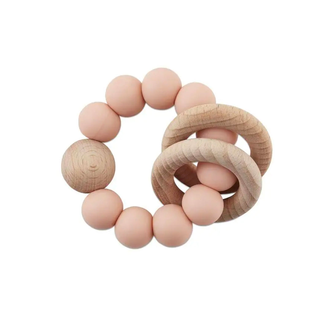 Designed with safety in mind, this teething ring contains buttery soft, 100% food-grade silicone beads + natural, untreated beech wood rings. The rings create a soothing rattle for your little one. Beech wood is naturally splinter-free + has natural antibacterial + antimicrobial properties. This teether is soft on baby gums + emerging teeth - perfect to soothe + entertain from newborn to toddler. Sold individually. Color is peachy blush pink.