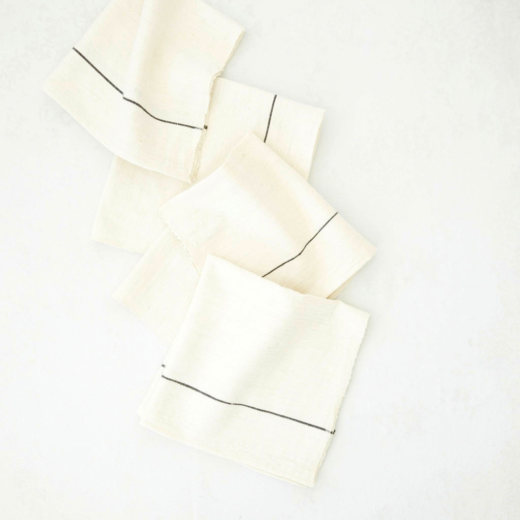 These beautiful, handwoven Ethiopian cotton napkins are incredibly soft yet durable. A thick cotton yarn gives the napkin wonderful feel + sturdiness. The thin stripe is an elegant + versatile design, perfect for any dining space. Color is natural with onyx black stripe. Sold as a set of 4.