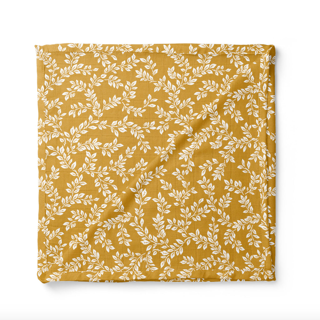 Printed on 100% cotton muslin, this baby swaddle blanket is soft, lightweight + cozy. Designed in a fun + vibrant pattern out of breathable material, this swaddle can also be used as a nursing cover, a car seat + stroller cover, burp cloth, play blanket + more! Color is mustard yellow with white leafy sprigs.