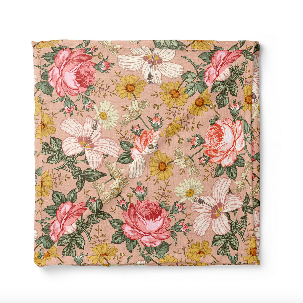 Printed on 100% cotton muslin, this baby swaddle blanket is soft, lightweight + cozy. Designed in a fun + vibrant pattern out of breathable material, this swaddle can also be used as a nursing cover, a car seat + stroller cover, burp cloth, play blanket + more! Color is peach with rosy pink blooms + yellow, white + green touches.