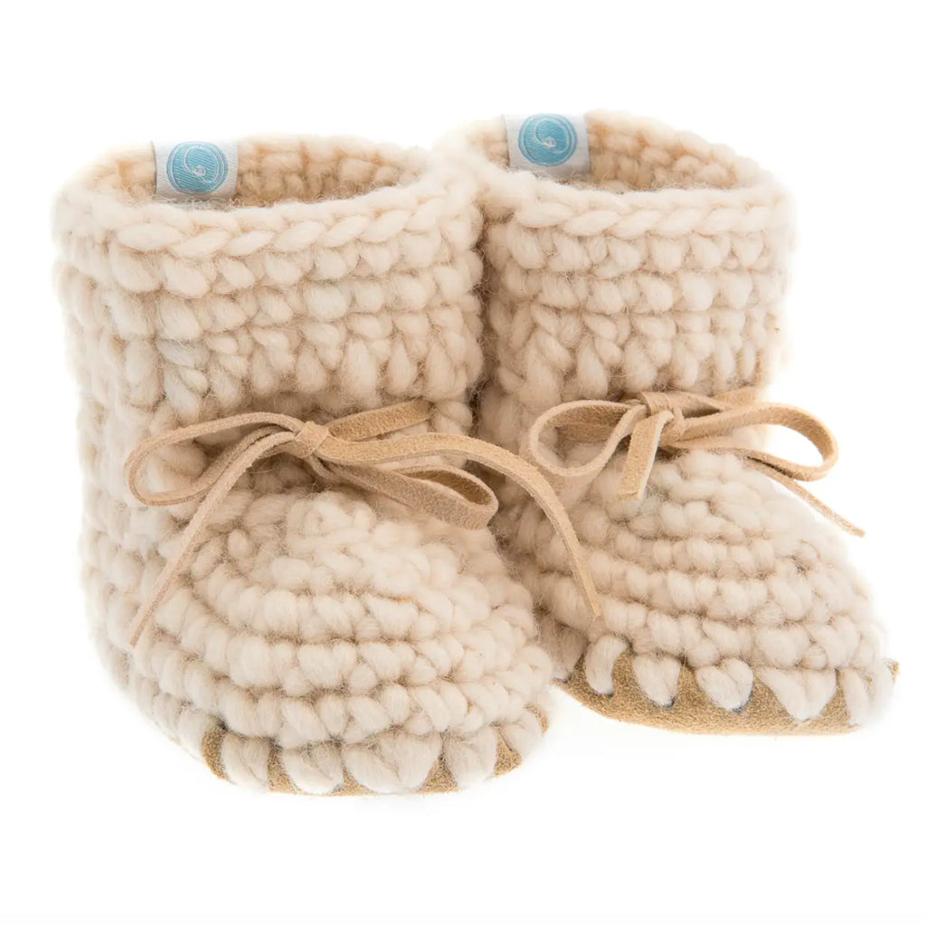 These adorable sweater moccasin booties are handmade out of the softest wool with a looped stitch leather sole + a leather tie. With a soft, fuzzy inner bottom lining, these shoes are super cozy + comfy for baby. Color is ivory cream with camel tan sole + tan laces.