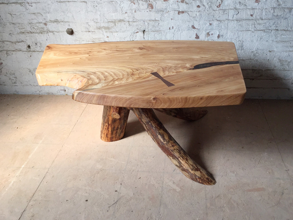 This compact coffee table is made from live edge Japanese elm with a single walnut butterfly closure that serves function + aesthetic. The base is made from a single branch of pine that came down in the artist's backyard during Hurricane Sandy + the creamy, polished grain in the slab of elm looks like flame flowing up through the wood.