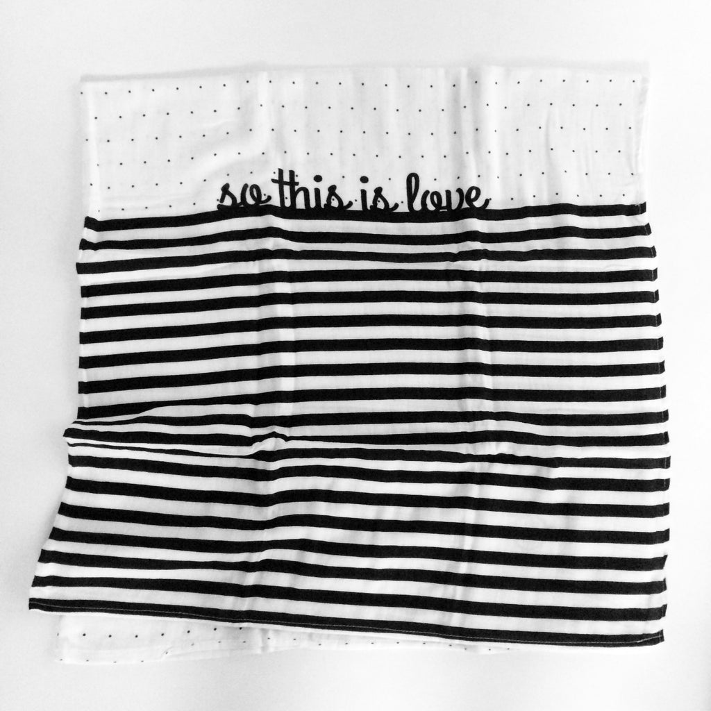 This whimsical blanket is the perfect size for swaddling, stroller, car seat, snuggling + changing. Printed on premium, ultra soft, 100% organic cotton muslin, it's lightweight + a stylish yet cozy sense of comfort + security for your baby. Sold individually. Text: "so this is love." Color is black + white.
