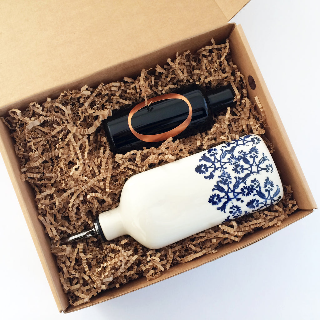 This box contains a delicious Spanish oil + a gorgeous bottle to store + display it in. It's the perfect pair for a housewarming or holiday gift - or simply for anyone who loves dipping bread!