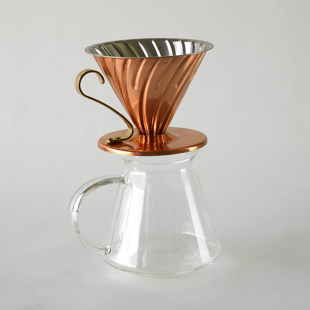 This bright, polished copper coffee dripper perfectly matches the Copper Buono Kettle, both developed in-house by Hario Japan. The metal filter cone highlights its uniqueness + flavor-enhancing spiral ribs, which extract the most subtle hints of flavor. The ridges also form insulating air channels which help maintain an even brewing temperature within the filter. This dripper will sit comfortably atop the Yama Decanter, as well as many other servers + coffee mugs + pairs with Hario 02 paper filters. Copper dripper piece sold individually.