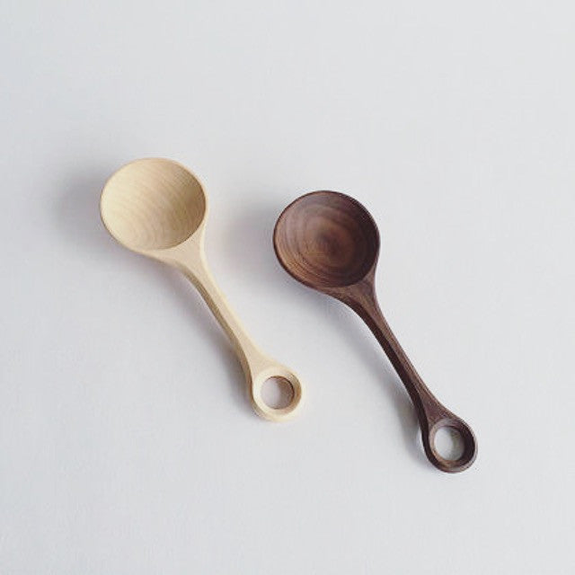 This lightweight coffee scoop is the ultimate upgrade over those disposable plastic scoops. Made from rich brown black walnut or creamy sugar maple, the bowl of the scoop is left lightly textured with the knife marks from carving. While intended for coffee, this scoop is handy at grabbing a tablespoon of any dry ingredient from all types of containers. Sold individually. Wood options available.