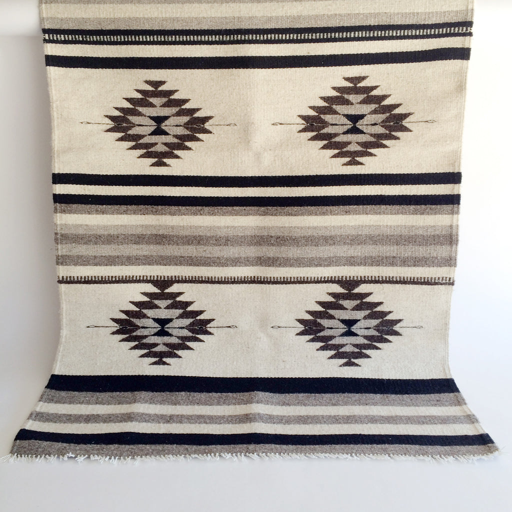 Handmade in Teotitlán del Valle, Oaxaca, Mexico, this rectangular wool rug has been custom designed + handwoven, preserving the art form of the Oaxacan village in the Zapotec culture. We had the privilege of working directly with the Gutiérrez family to customize the rugs, making each design truly unique to this shop, all the while staying true to the Zapotec tradition. This rug will look perfect alongside or at the foot of a bed, under a coffee or end table, in a hallway or in front of a doorway - this gorgeous piece of artwork utilizes neutral, handspun wool that will complement any space. This traditional design pictures geometrical diamonds with stripes in between. Color is natural undyed cream, natural brown, grey + black with cream base. Size options available.