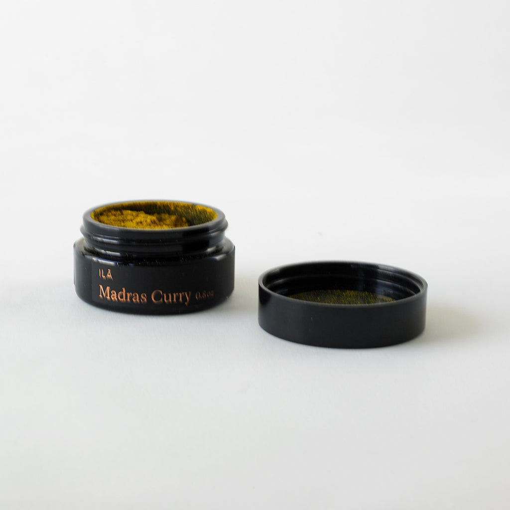 Ancient Madras, Indian blend of curry leaf, turmeric, coriander, cumin, cinnamon, cloves, bay leaves, fenugreek, allspice, black pepper, cayenne + crushed red pepper.