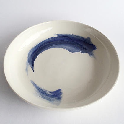 Each shallow porcelain dish is wheel thrown, then slightly hand-altered to form a more organic shape. It is glazed clear with dark blue abstract marks. Each has its own unique markings + has been made exclusively for this shop. No 2 pieces are the same. Colors are blue + white. Sold individually.