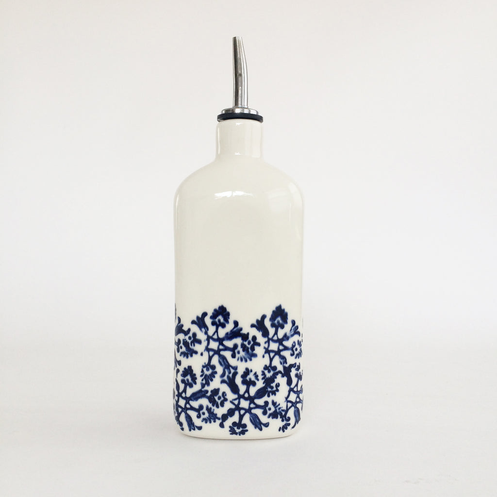 This handmade bottle has an inox spout + is perfect for holding olive oil or vinegar. The design + detail will add an antique-like charm + beauty to your kitchen counter or open shelves - no way you can hide it inside a cabinet! Colors are blue + cream white. Sold individually.