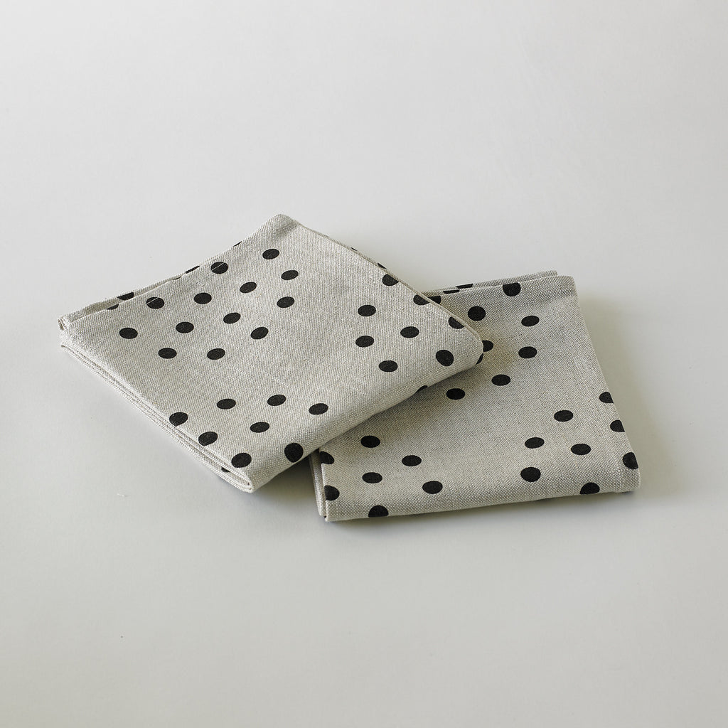 This kitchen towel, made of 100% linen fabric, is absorbent, sturdy + softens with each use. It features handprinted dots in colander shapes with noir ink (a deep, dark grey) on a natural oatmeal linen. Sold individually.