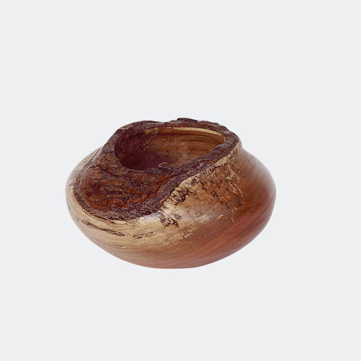This hand-turned cherry burl bowl has a hollow-out form with delicate, live edges.